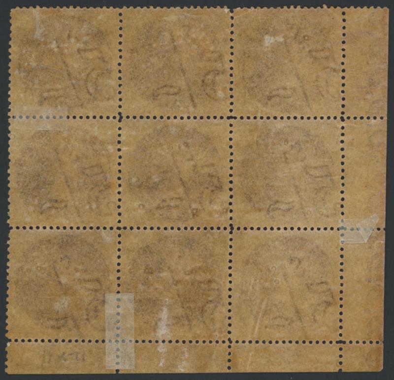1897-99 QV Coin Re-Issue 5/- reddish-purple Perf 12x11 SG 297e corner block of 9 from the lower-left of the sheet with Convolvulus