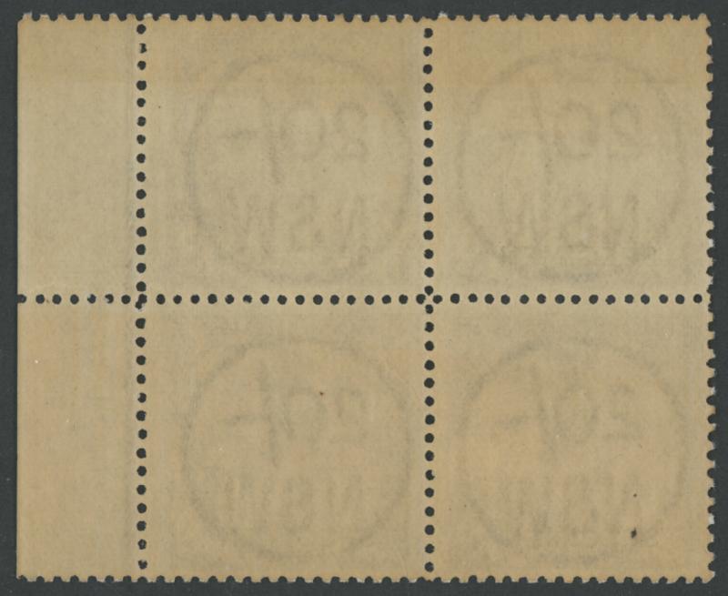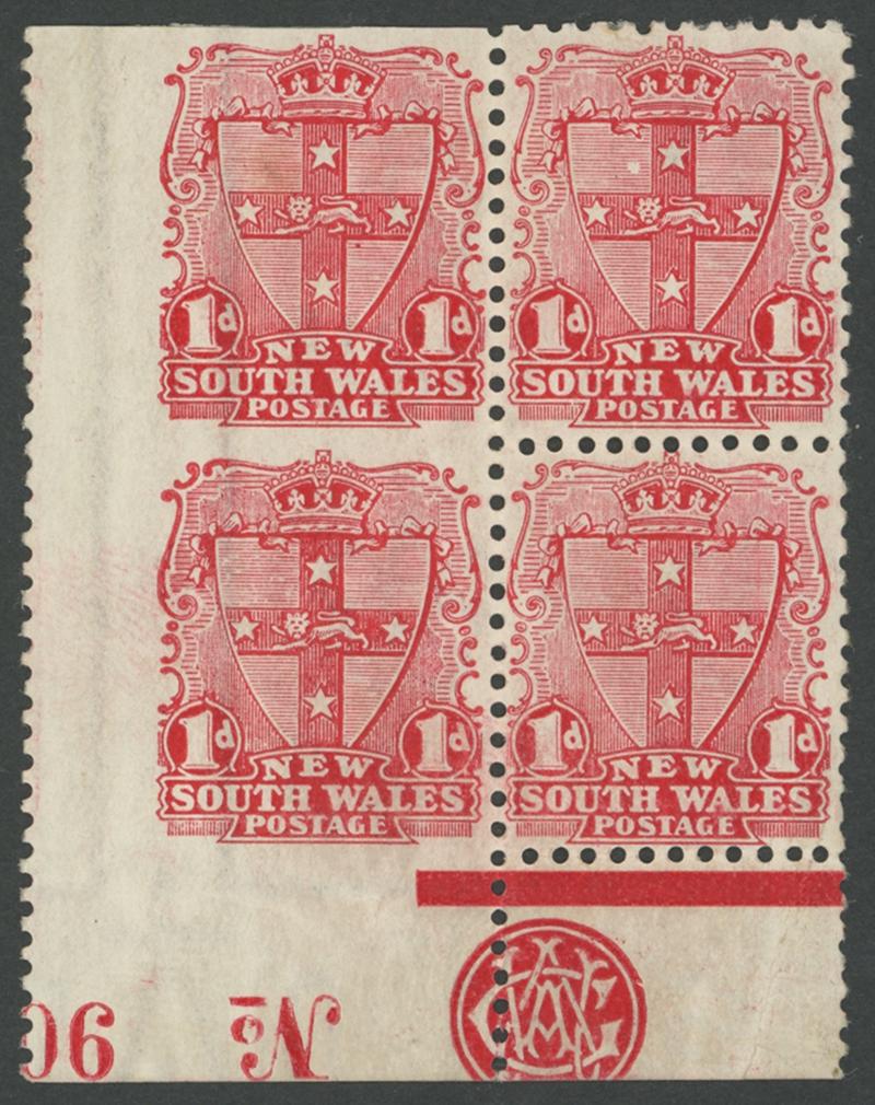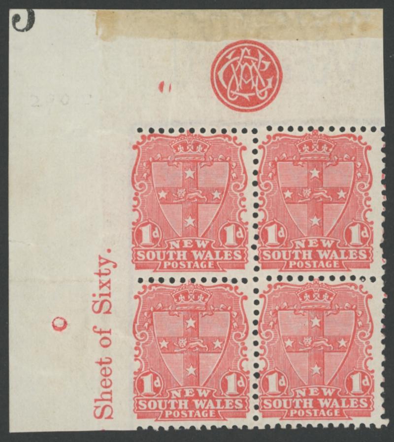 1899 Chalk-Surfaced Paper Crown/NSW Watermark '40' Arms 1d carmine block of 4 from the lower-left of the right-hand pane, the