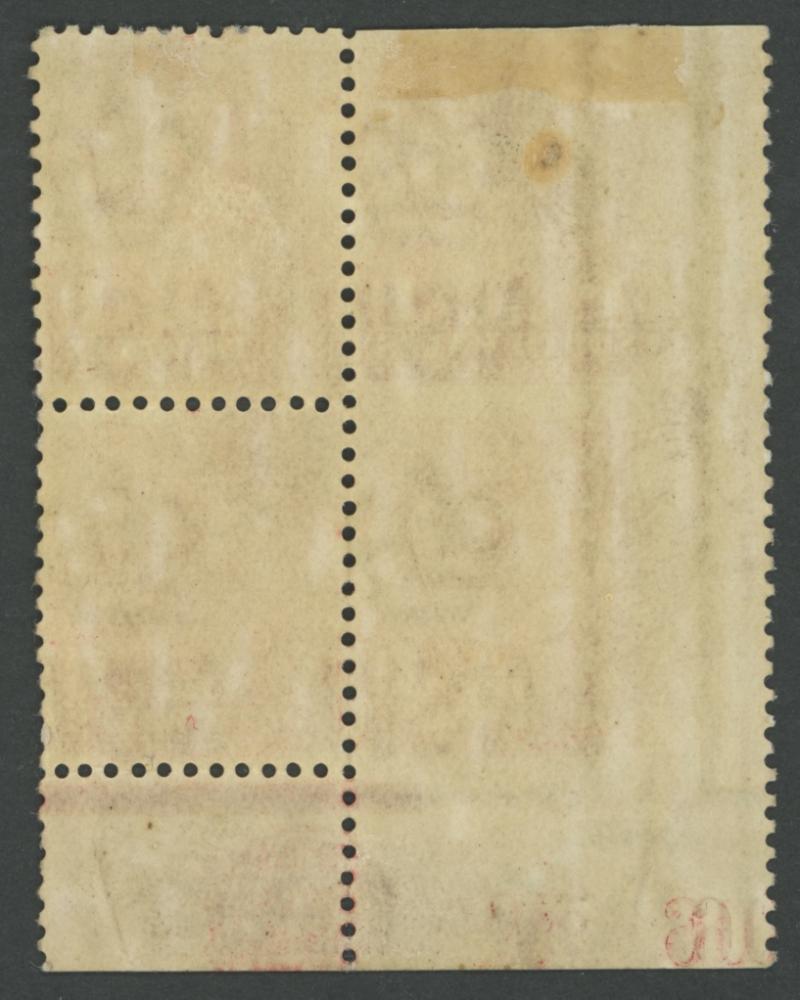 left-hand units being Imperforate on Three Sides SG 300a, 'WAG' Monogram of the Government Printer WAGullick and part-Sheet Number in the margin at base, Cat £1200. Ex Ric Slade-Slade and William Frazer: sold in 2003 for £690. (Image1) (Image2)