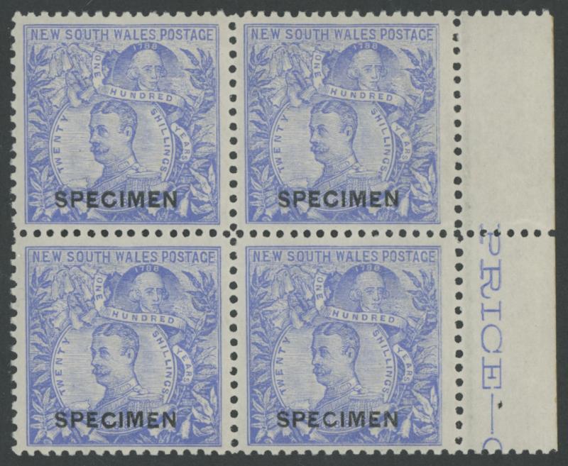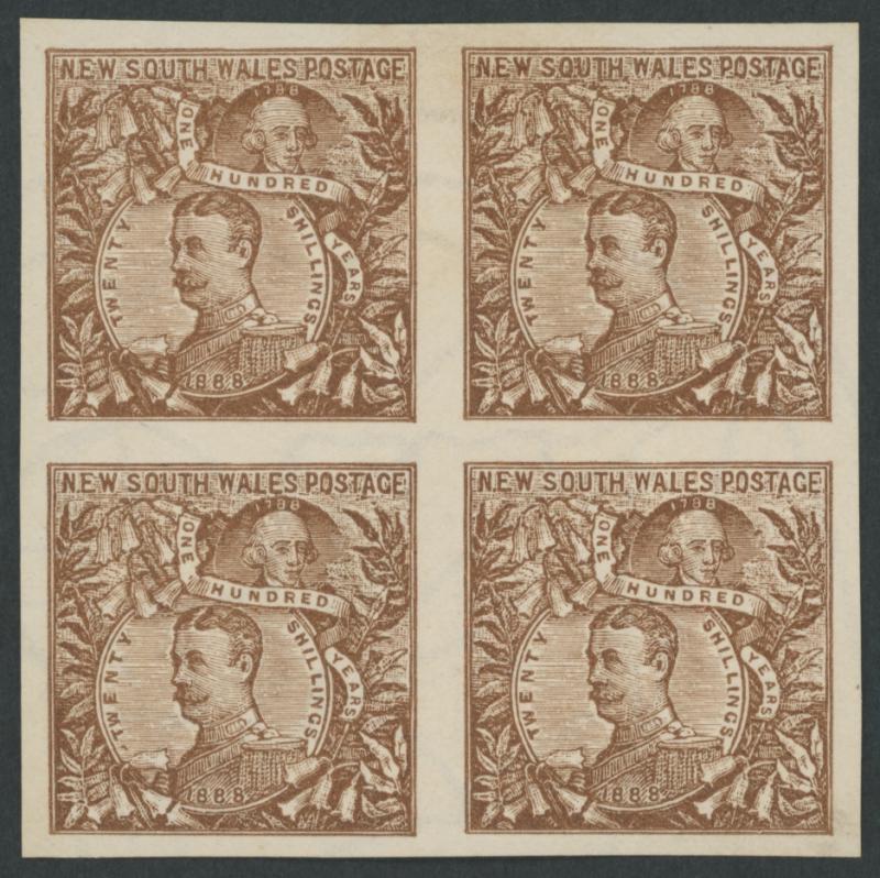 1888-89 Centennial 20/- Governors imperf colour trial block of 4 in chocolate-brown on ungummed paper with an elaborate circular