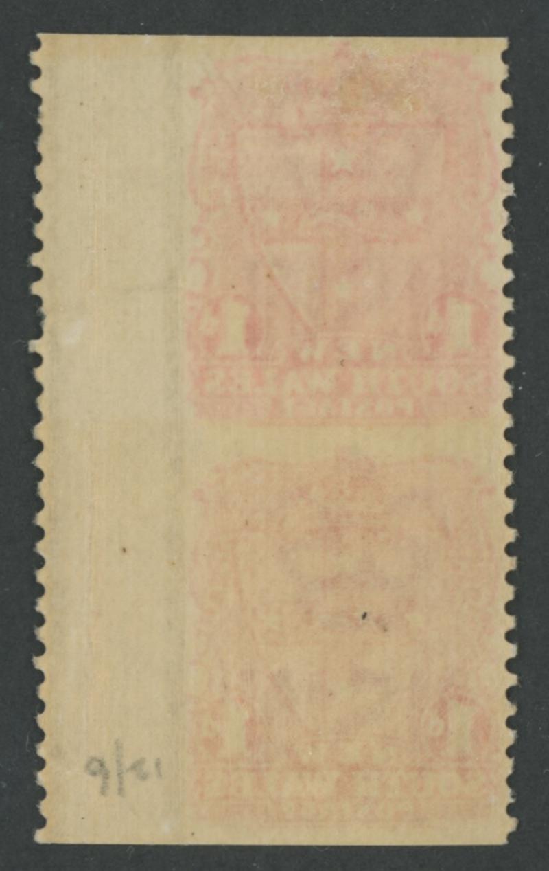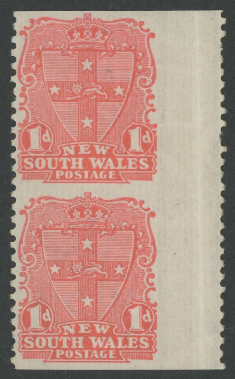 1899 Chalk-Surfaced Paper Crown/NSW Watermark '40' Arms 1d carmine-pink as SG 300 Imperforate at Left between stamps & margin block