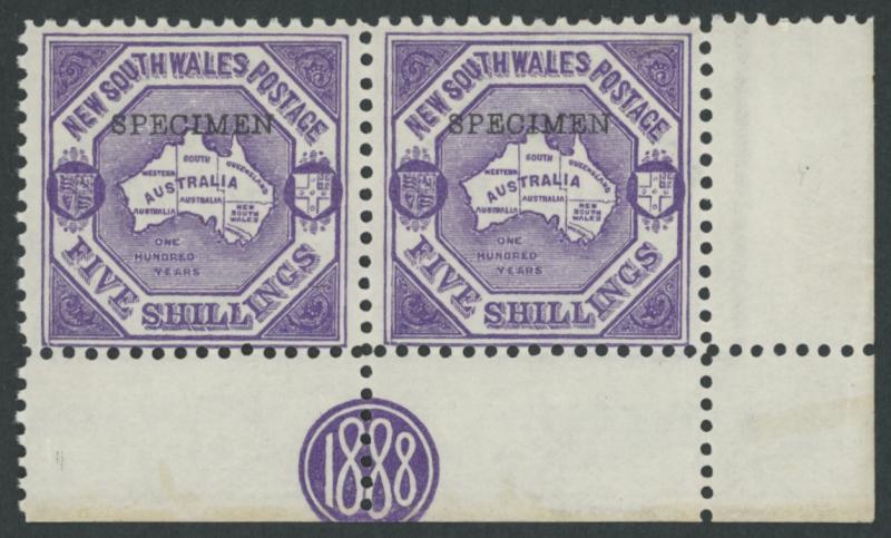 1888-89 Centennial New Watermarks 5/- lilac Perf 11 SG 263a with seriffed 'SPECIMEN' Type 12, lower-right corner pair with '1888'