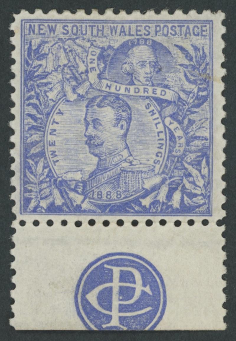 1888-89 Centennial New Watermarks 20/- ultramarine Perf 11 SG 264c marginal example from the base of the sheet with large-part 'CP'