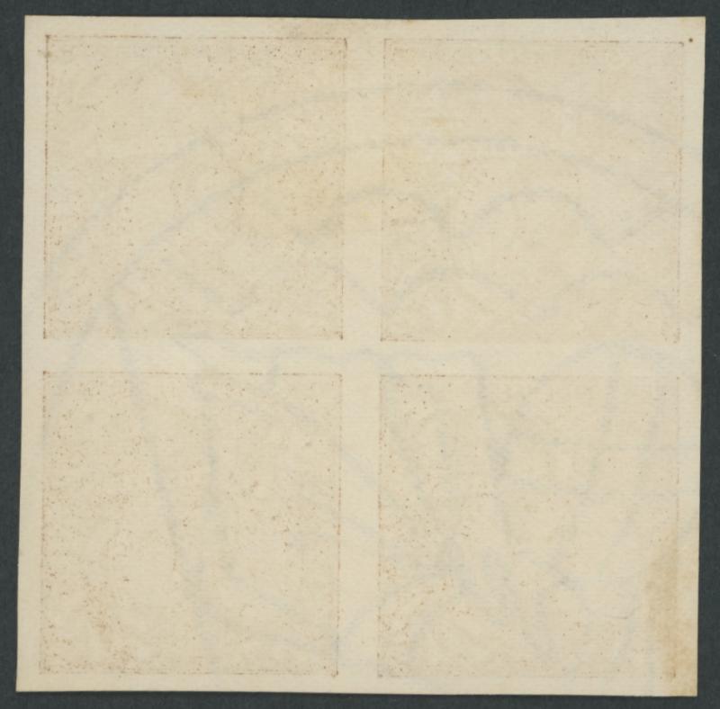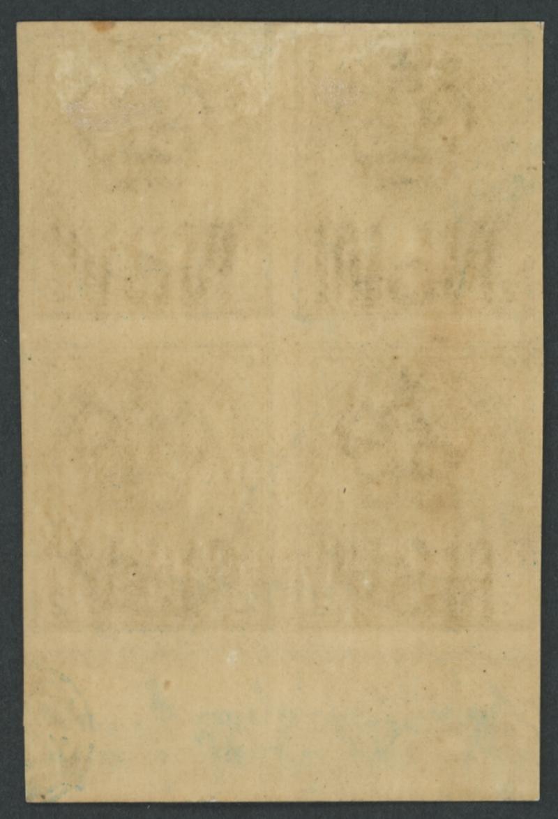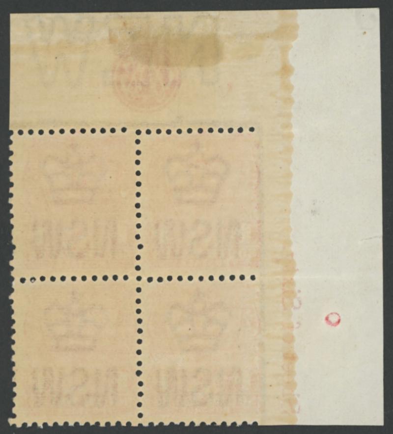 sheet watermark across all units, large even margins. Rare. In 1988 Rodney Perry offered by private treaty ("Price on Application") a 'set' of 57 of the 65 possible colours all in blocks of 4, including this block. Richard Breckon, writing in 'The