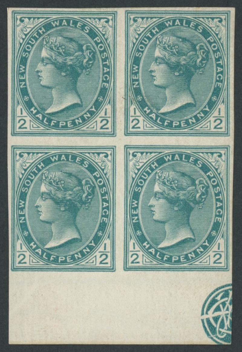 1899 Chalk-Surfaced Paper Crown/NSW Watermark '40' QV ½d bluish-green Imperforate Block of 4 SG 298a from the base of the sheet