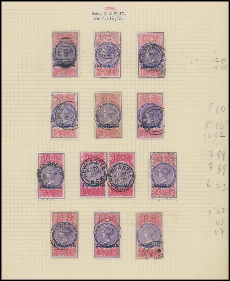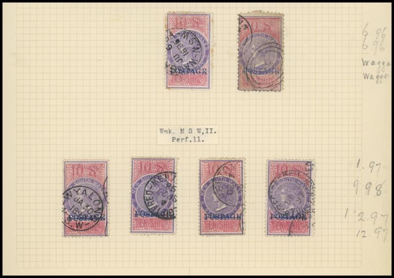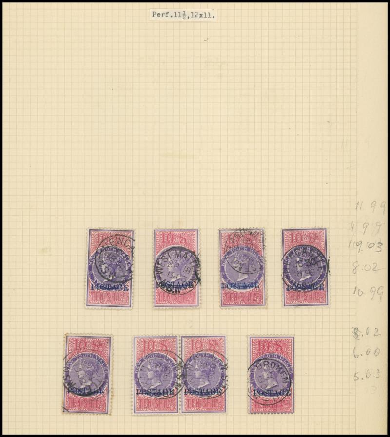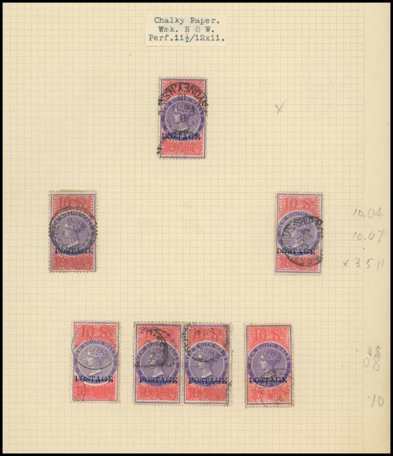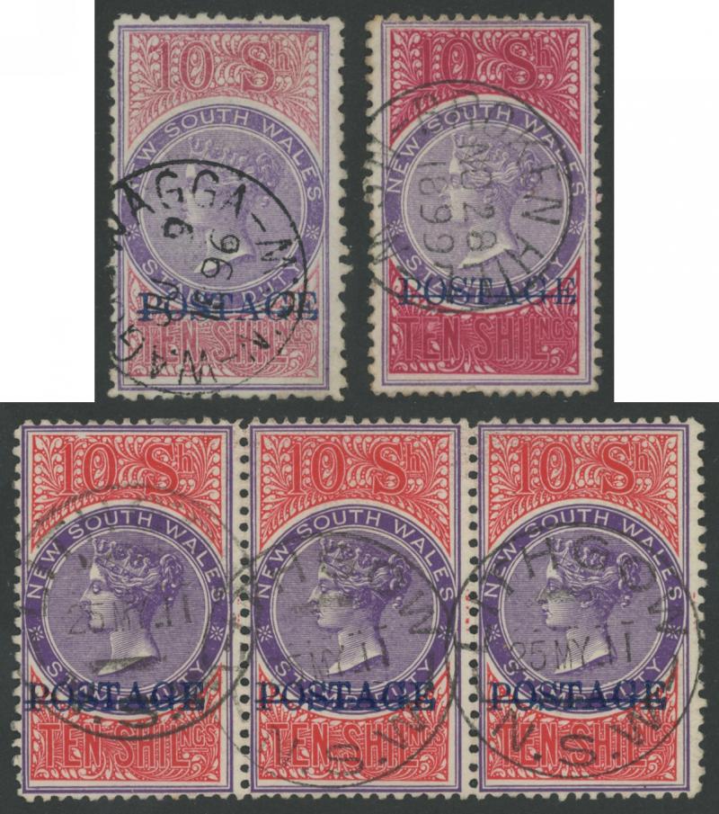 1894-1904 QV Tall Fiscals 'NSW' Watermark '59' Overprinted 'POSTAGE' in Blue 10/- group from the very scarce Perf 10 on Bluish