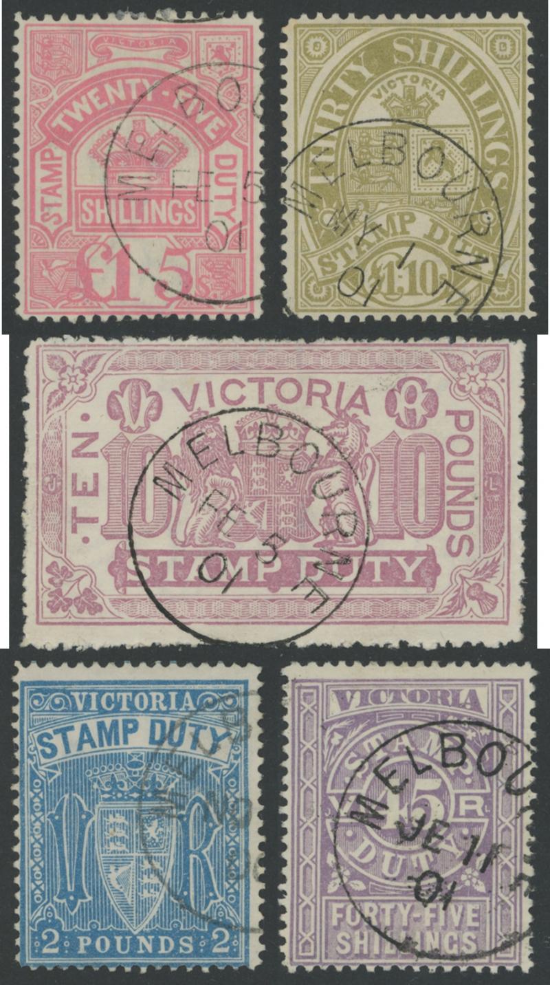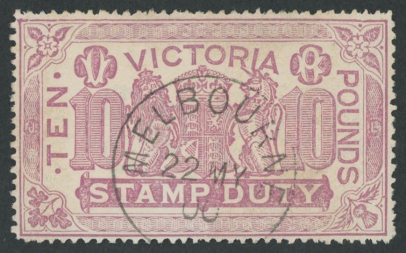 1884-96 Large Stamp Duty Validated for Postage Typographed Perf 12½ £10 mauve SG 279 CTO with Melbourne cds cancel, well-centred,