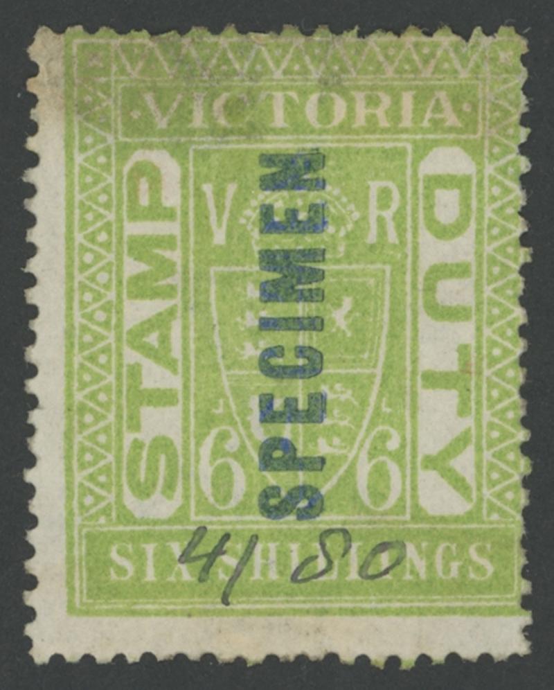 1884-96 Large Stamp Duty Validated for Postage Litho 6/- apple-green SG 239 with sans-serif 'SPECIMEN' Handstamp (KTM Type 11c;