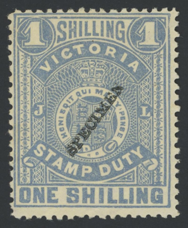 1884-96 Large Stamp Duty Validated for Postage Typographed Perf 12½ 1/- chalky blue/lemon SG 257 with tiny seriffed 'SPECIMEN'