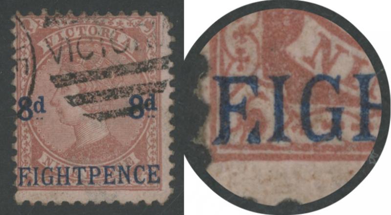 1876 Surcharge '8d 8d/F.IGHTPENCE' in Blue on QV Bell 9d brown/pink SG 191a, Melbourne duplex cancel well clear of the error, Cat