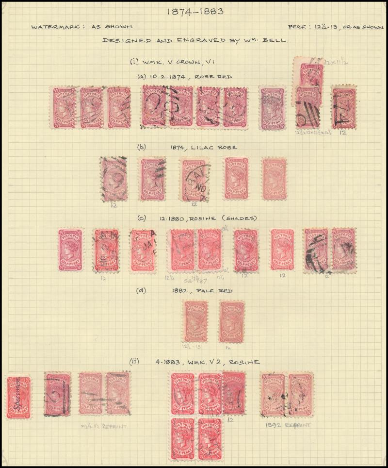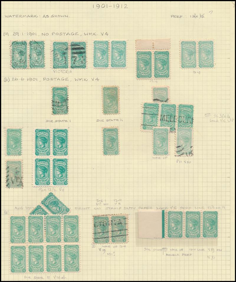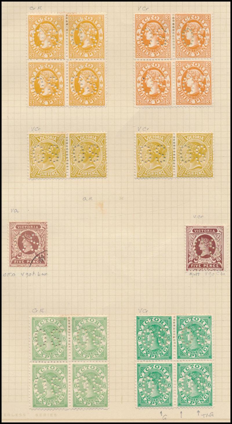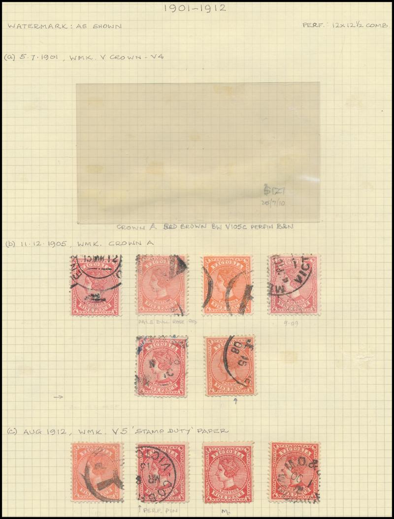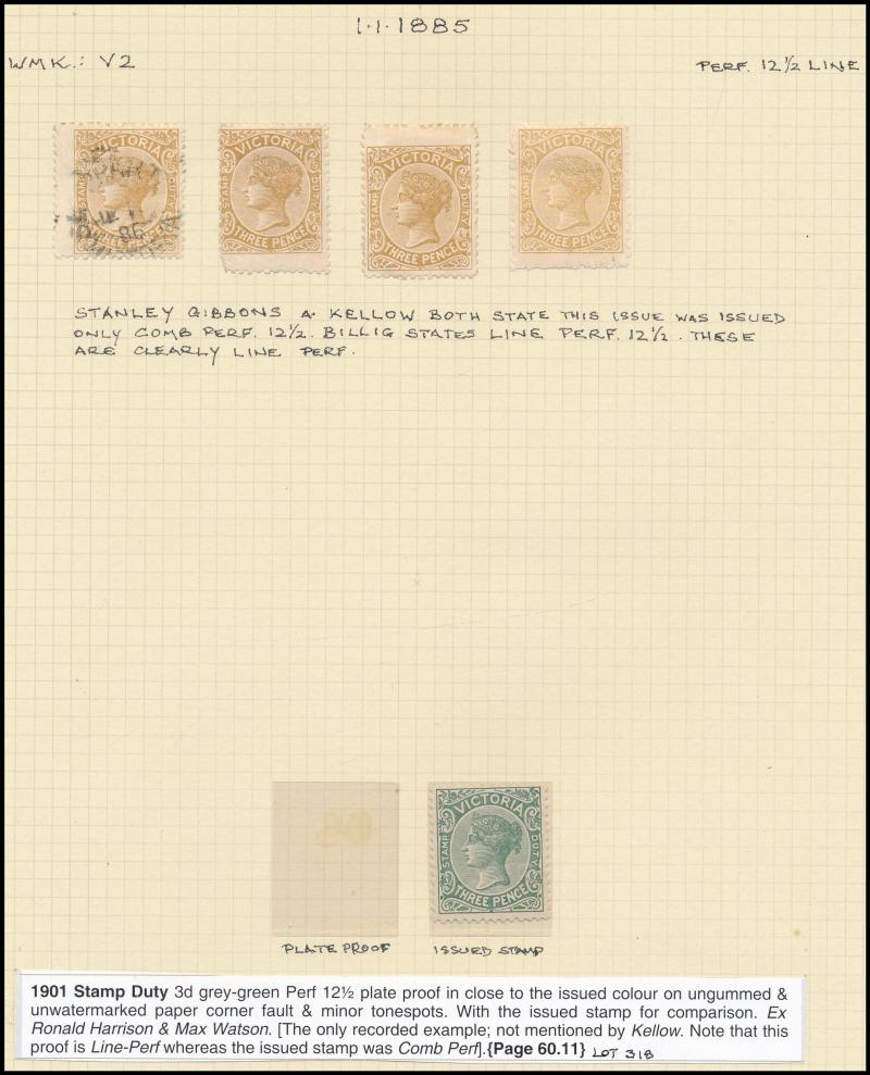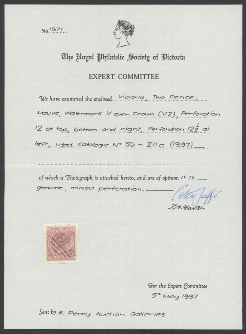 the design through 'VICTORIA' at top. This is the stamp illustrated by Geoff Kellow at page 202, where he states it to be the only recorded example. The only other stamp of which we are aware - Irregular Compound Perfs 12x12x12x12½; also Cat £750