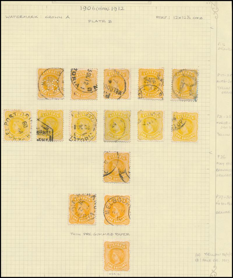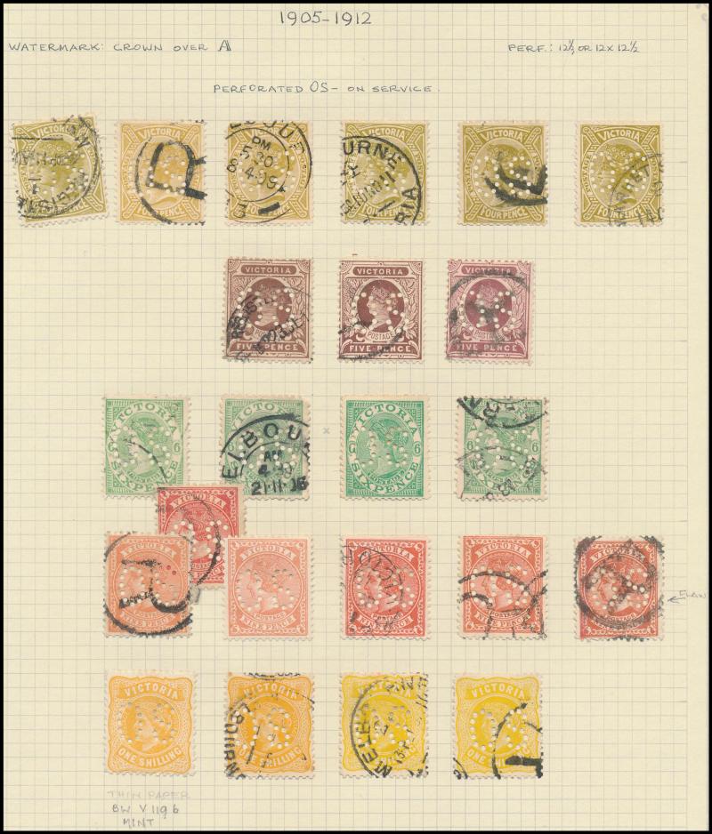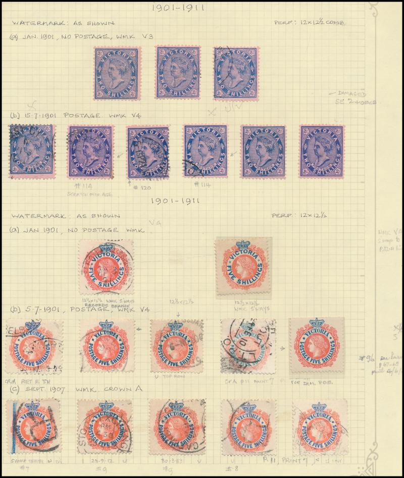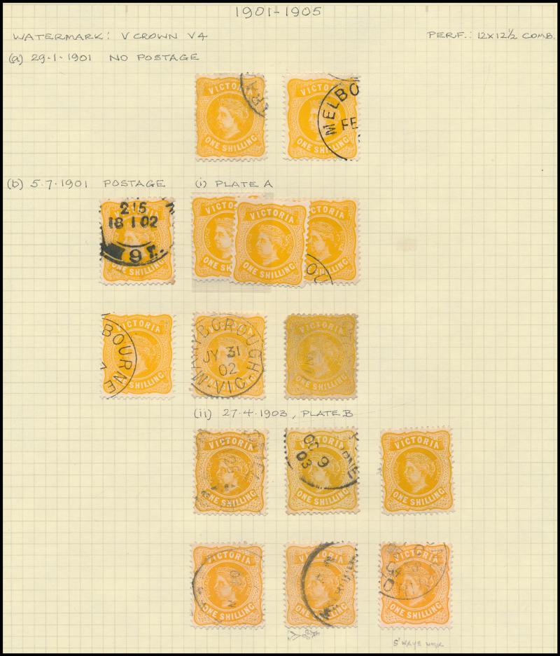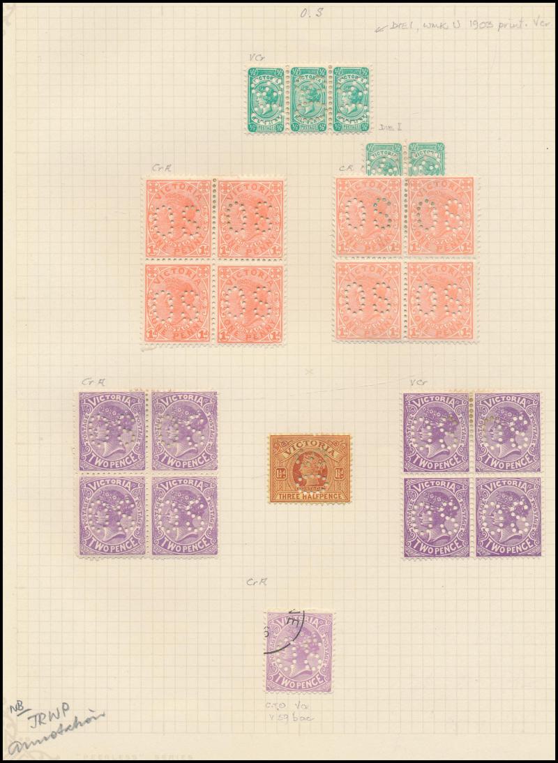 ungummed unwatermarked paper (Ex Ronald Harrison and Max Watson), 1901-12 to 5/- x12 including Crown/A 2d Perf 12x11x12x12½ SG 448 (heavy cancel, Cat £650; RPSV Certificate), CTO to 5/- including 1901 1d olive blocks of 8 and 30, punctured 'OS' mint