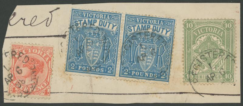QV Naish 4d tied to linen-backed piece by 'REGISTERED/AP6/98/MELBOURNE' cds, minor blemishes, Cat £560+ for CTO. An unrecognised postally used rarity. Ex Max Watson: sold at our auction of 3.4.2017 for $2315 (Sale 220 Lot 76).