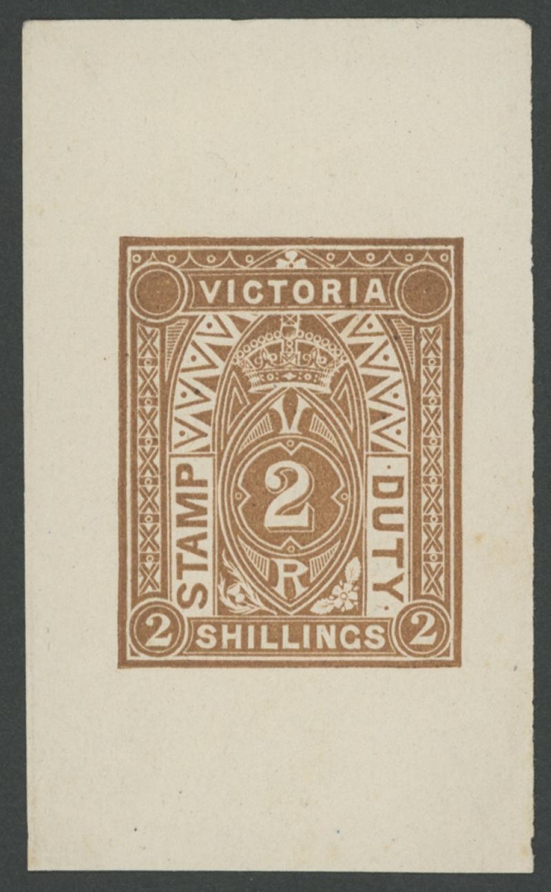 yellow-brown on wove paper with margins large to huge. Superb. Illustrated by Geoff Kellow at page 240, where he records eight similarly unfinished die proofs. A slightly smaller example on greenish paper sold at our auction of 15.8.2014 for $1045