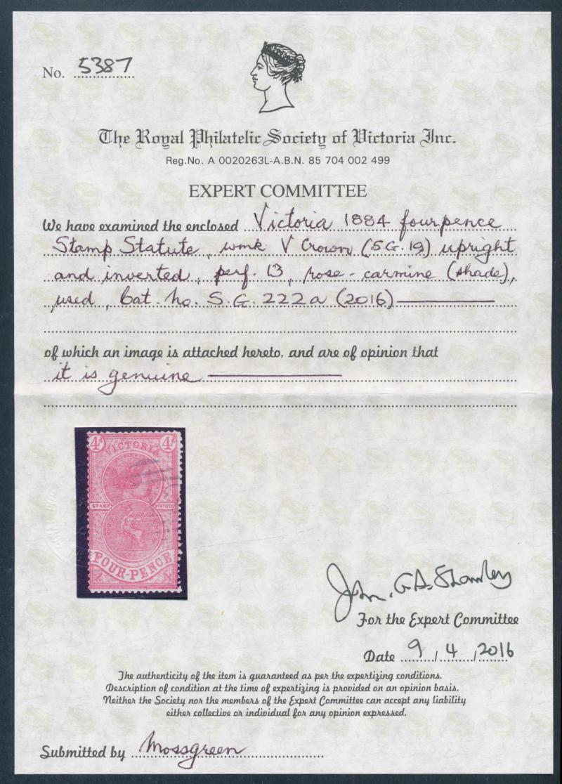 1884 QV Stamp Statute Validated for Postage V/Crown 4d rose-carmine with the Watermark Upright (Inverted) SG 222a, postally used