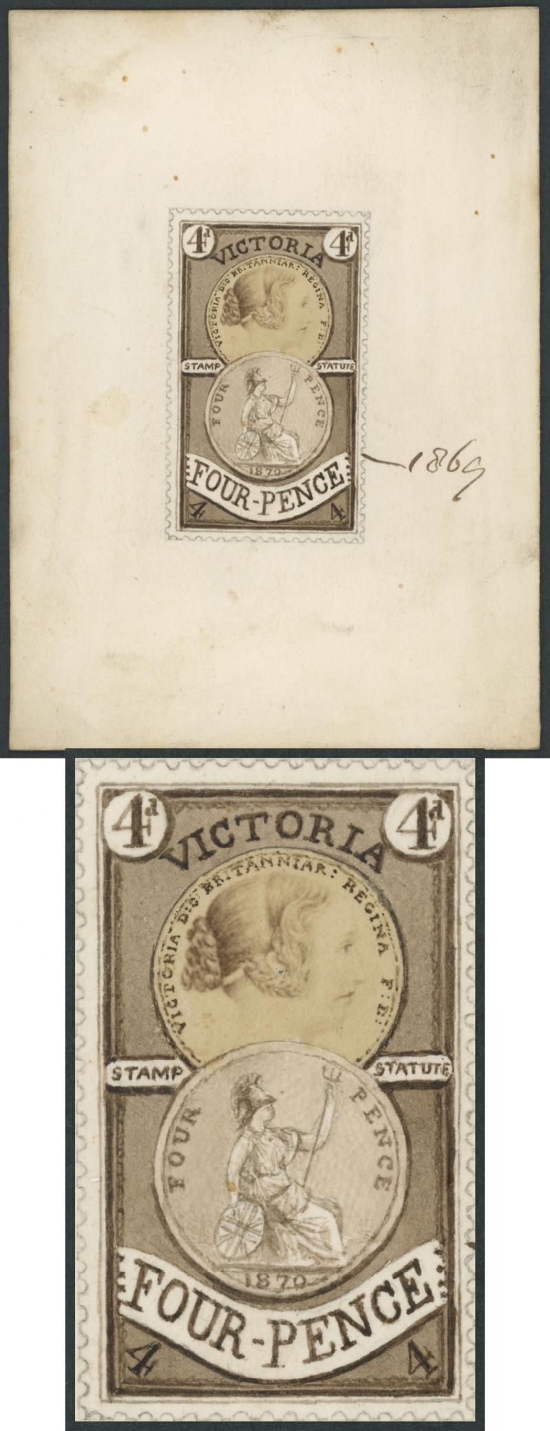 1884 QV Stamp Statute Validated for Postage 4d original stamp-size artwork in shades of brown and pencilled perforations, endorsed