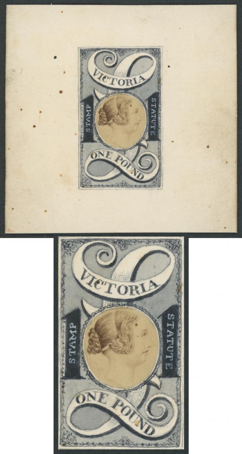 1884 QV Stamp Statute Postal Fiscals £1 stamp-size largely hand-painted composite essay in grey & black with Chinese white