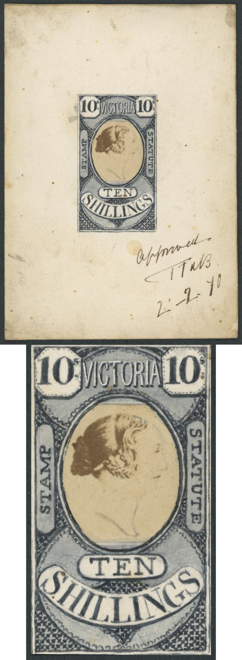 1884 QV Stamp Statute Validated for Postage 10/- stamp-size largely hand-painted composite essay in grey & black with Chinese white