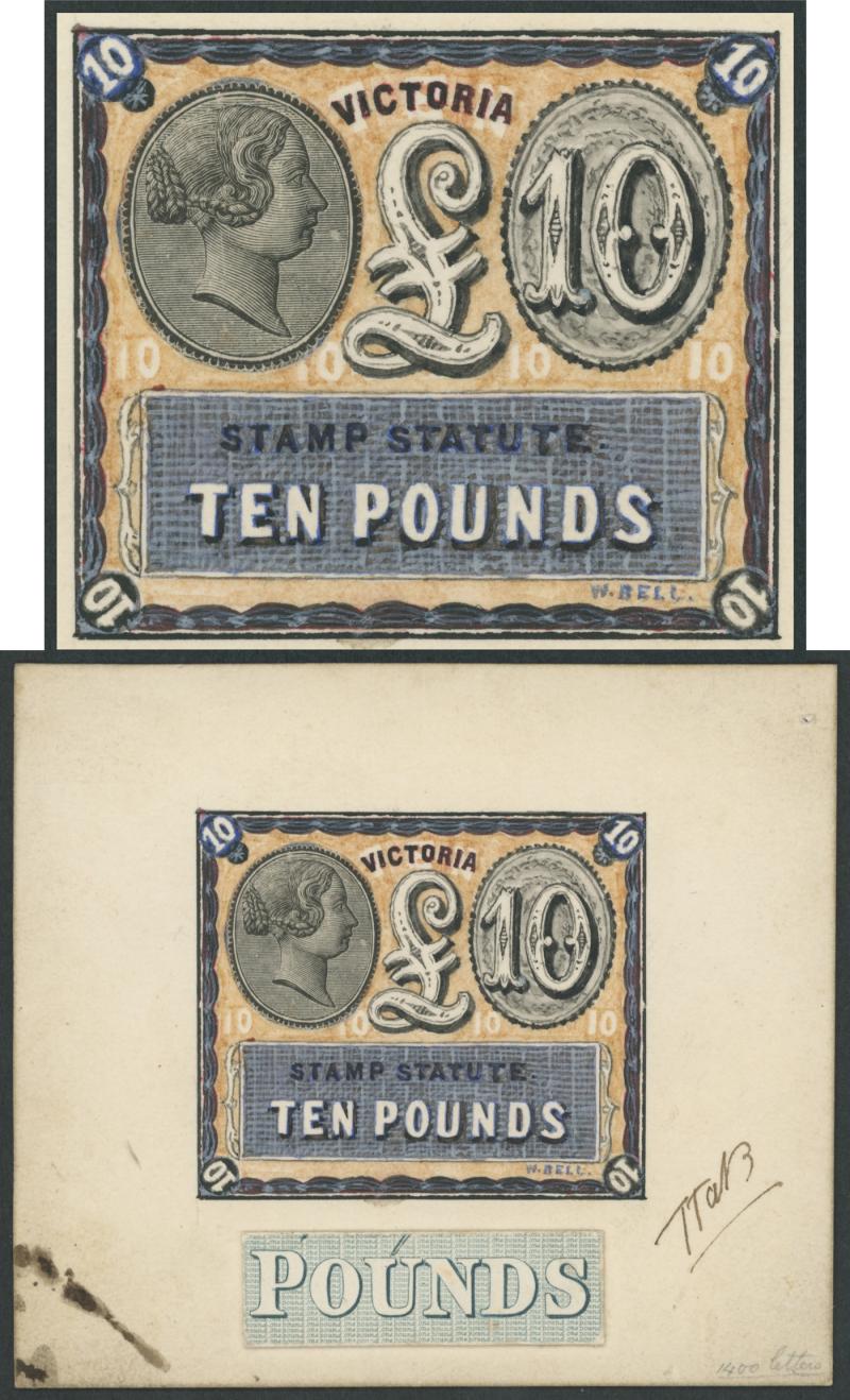 the highest denomination for which William Bell prepared artwork. However, the famous £5 black & yellow-green was the highest denomination actually issued. (Image1) (Image2)