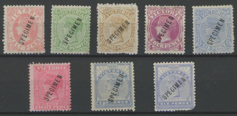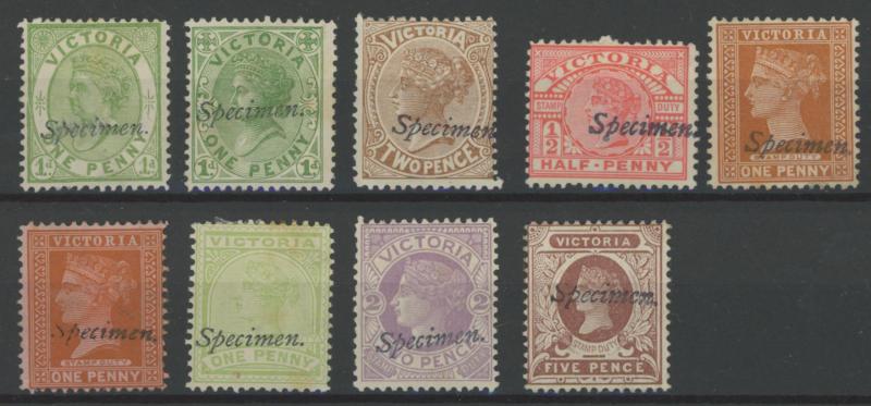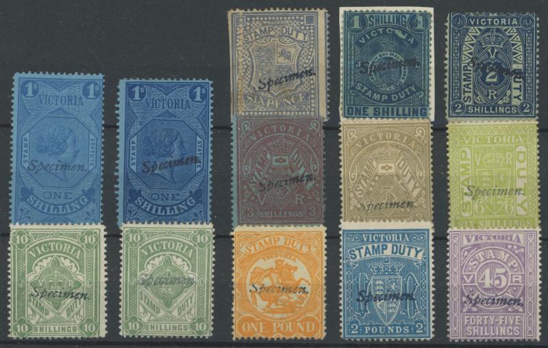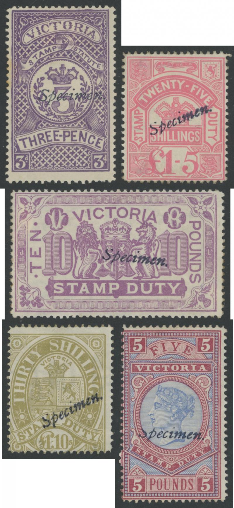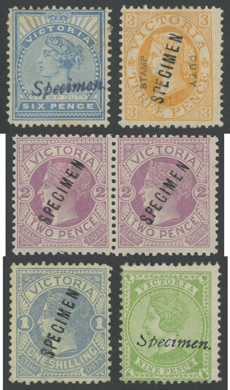 'STAMP DUTY' 3d, and italicised 'Specimen.' Handstamp x11 on values to 9d apple-green, a few minor faults, most with part- to large-part gum.