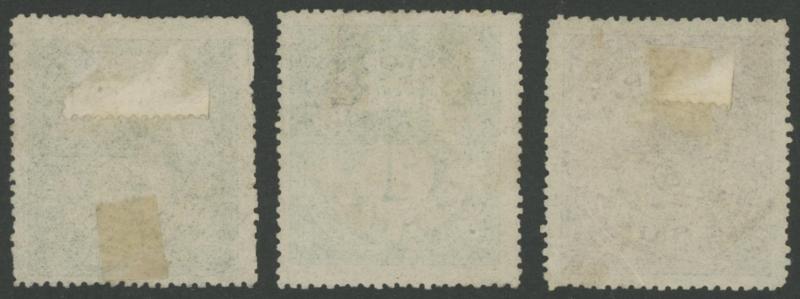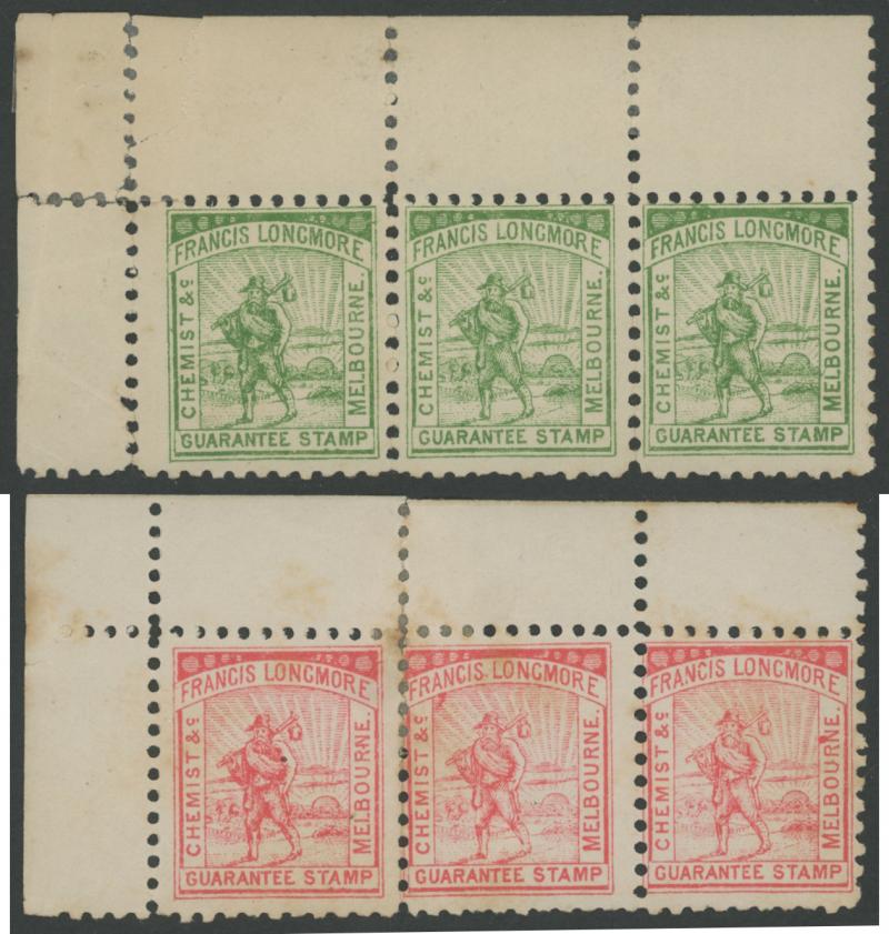 CINDERELLAS: circa 1890s Francis Longmore Chemist (Melbourne) 'GUARANTEE STAMP' corner strips of 3 in green (the corner selvedge