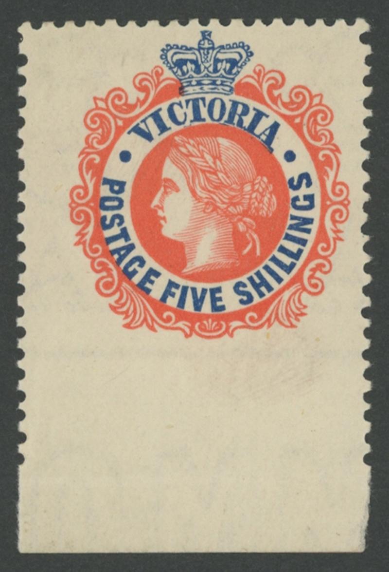 1905-13 QV 'POSTAGE' Crown/A 5/- rose-red & blue SG 430a marginal example from the base of the sheet Imperforate at Base ACSC