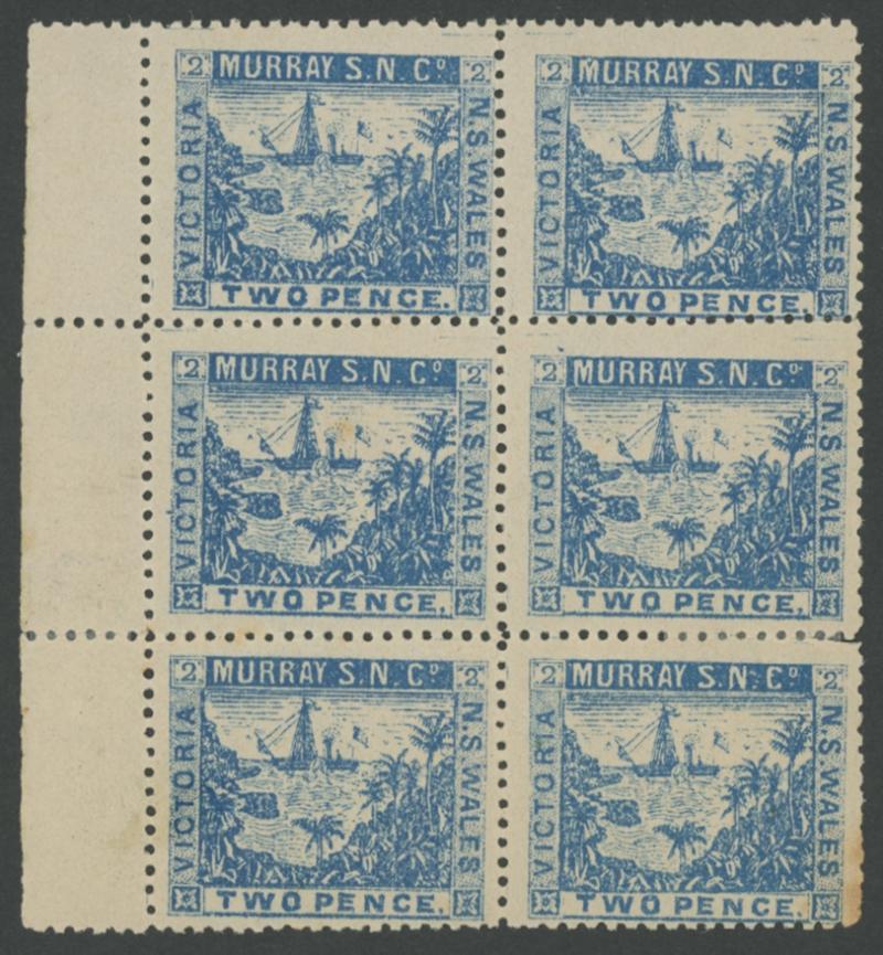 MURRAY RIVER STEAM NAVIGATION COMPANY: 2d blue block of 6 (2x3; from a sheetlet of 10) with margin at left, a couple of minor