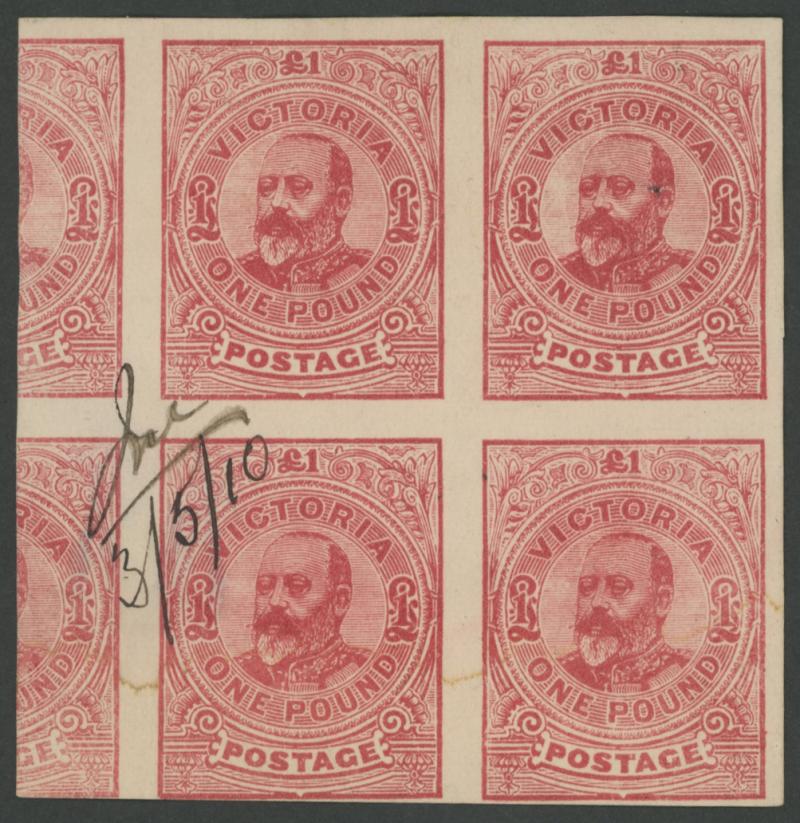 ACSC V109(E)1, Cat $10,000. Superb and unique. Ex J Oliver (Head of Engraving Department, Government Printers Office), JRW Purves, Rodney Perry and Hugh Morgan: unsold in 2012 with an estimate of £15,000. Later sold privately for A$15,000. An
