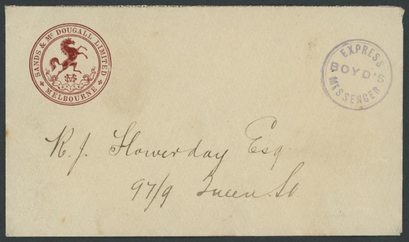 COURIER STAMPS: circa 1894 illustrated advertising envelope for Sands & McDougall Ltd (Printers) locally used at Melbourne with
