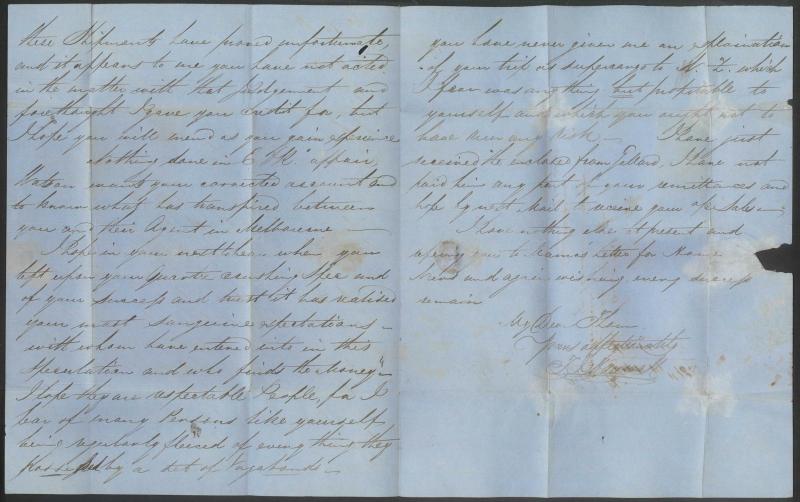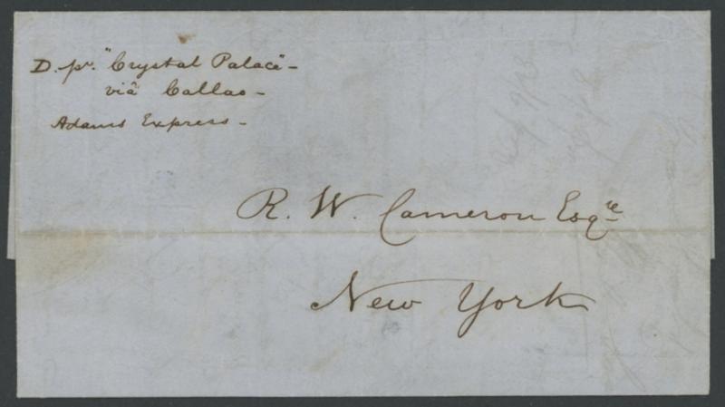 Palace/via Callao/Adams Express" and carried outside the mail, minor soiling & light horizontal fold. Very scarce trans-Pacific Express Company mail. The sender states gold is at "80/6d" (£4/6/-) per ounce. (Image1) (Image2)