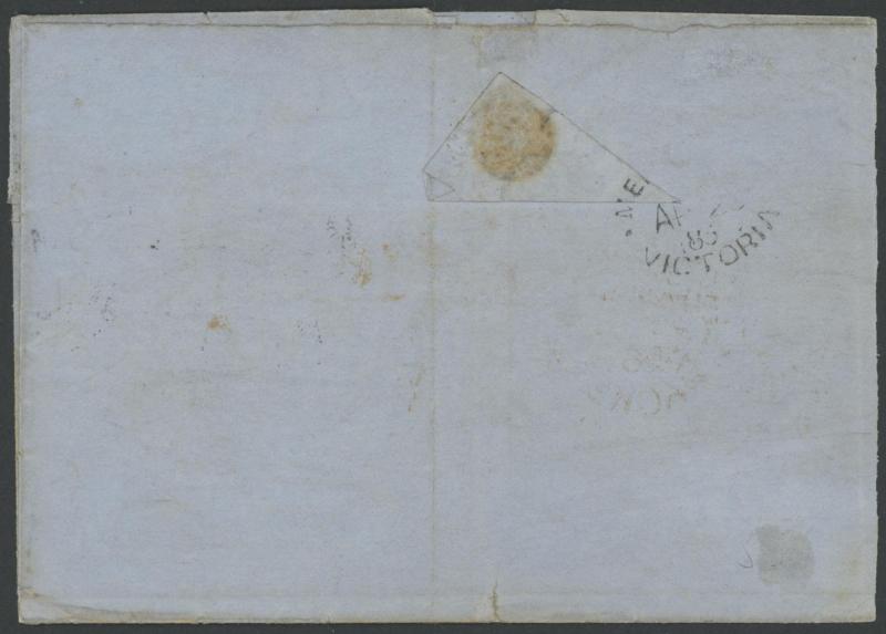 across the adhesives, light but legible 'PARKHILL/MY 24' arrival backstamp, a little minor staining on the reverse. Ex John Barwis. Posted during the 'retaliatory rate' period after Victoria unilaterally raised the uniform ship letter to Great