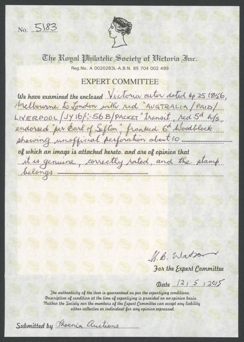 and 1857...[They] must be classed, in the absence of any other evidence, as private and unofficial". RPSofV Certificate (2015) states "it is genuine, correctly rated and the stamp belongs".