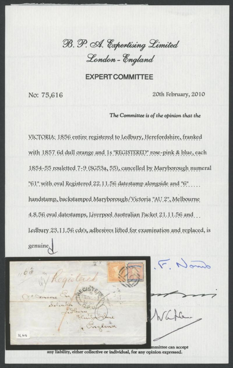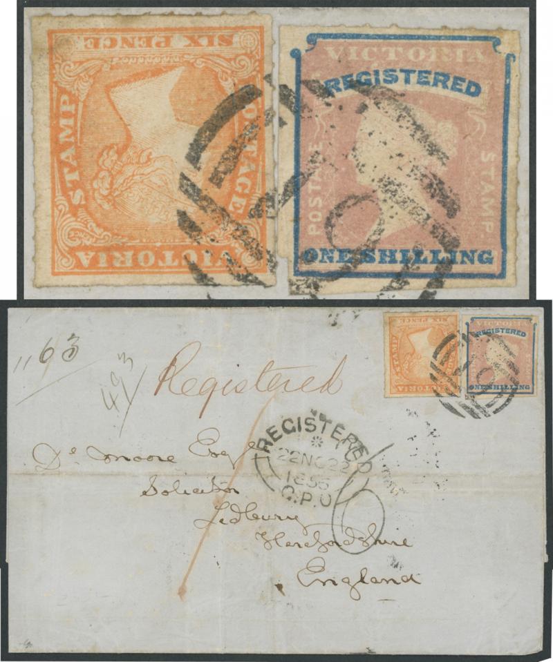 registered mail, ironed-out folds well clear of the stamps. One of the most important registered covers of Victoria. Ex Max Watson: sold at our auction of 8.10.2005 for $19,800 (Sale 118 Lot 623).