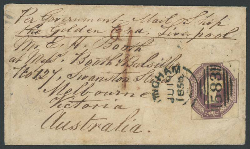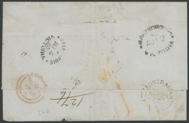 fine 'd/1' large accountancy handstamp in red on the face, Melbourne 'SE 11/1856' oval arrival on the reverse, minor blemishes. Ex John Barwis. Carried by clipper sailing ship 'Golden Era' departing Liverpool 20.6.1856 via Cape of Good Hope and met