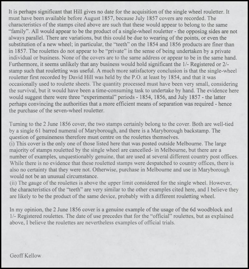 Melbourne. Kellow concluded: "...the cover is a genuine example of the [earlier] roulettes...I believe the roulettes are...examples of official trials". Subsequently, in 2010, a clear BPA Certificate was acquired. (Image1) (Image2)