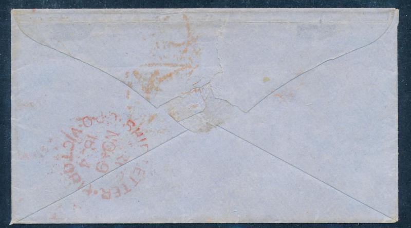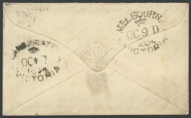 'PAID AT/CAMPERDOWN' bevelled-boxed handstamp in red and similar strike of crowned-oval 'CAMPERDOWN/VICTORIA' datestamp (the '22' inverted; ERD) unusually on the face, rated "6"[d] for the inland letter rate, partial Melbourne arrival backstamp and