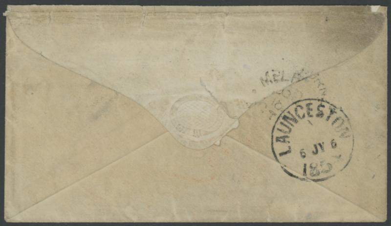 upper-right and crowned-oval 'HAMILTON/VICTORIA' datestamp unusually on the face at upper-left, rated "1/-" in red pencil for the ship letter rate, Melbourne transit backstamp and largely very fine Launceston arrival cds of '6 JY 6/1854' alongside,