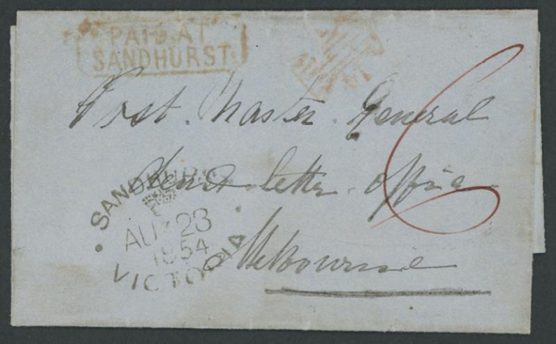 1854 (Aug 23) stampless outer to "Postmaster General, Dead Letter Office, Melbourne" with largely very fine 'PAID AT/SANDHURST'