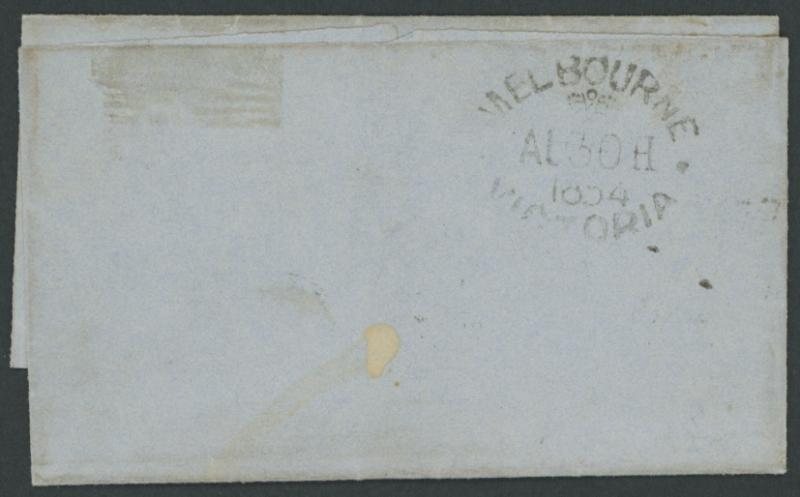 handstamp rated "8d" on the face, fair crowned-oval 'STEIGLITZ/VICTORIA' backstamp and largely very fine Melbourne arrival of 'AU30/1856' alongside, a couple of very minor blemishes. Ex John Barwis. The rate was 4d per ½oz intra-Colonial letter x2.