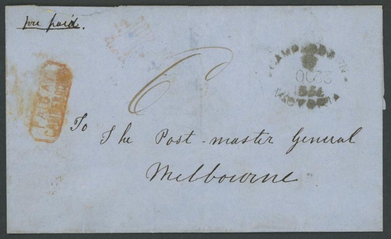 1854 (Oct 22) stampless outer to "The Postmaster-General, Melbourne" endorsed "pre paid" at upper-left with untidy but legible