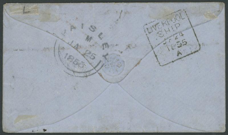 the face, largely very fine 'PAISLEY/JA 25/1855' arrival backstamp, light vertical fold clear of the stamp & markings and a closed tear across the back flap that does not unduly impinge on the backstamps. Ex Rod Moreton. Carried by the clipper ship
