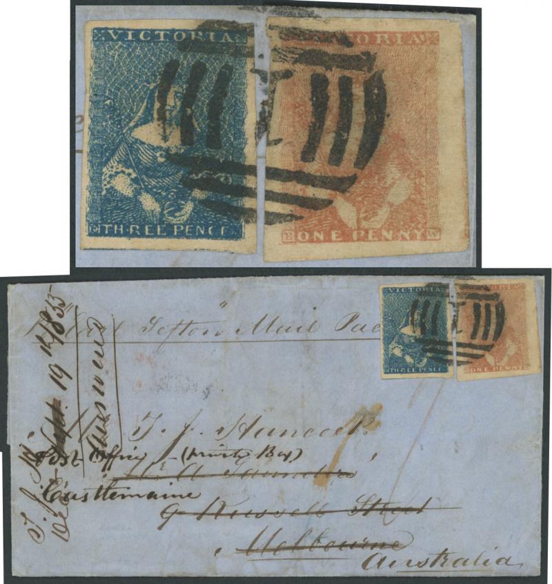 touching at right) tied by very fine Barred Oval '1' with Melbourne datestamp alongside, largely very fine 'LIVERPOOL/SHIPJA24/1855/A' boxed datestamp (Tabeart S18; in use for only a few months) in black on the reverse and a further strike in red on