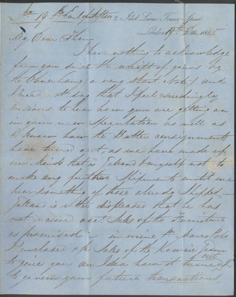 1855 (Dec 19) unstamped entire letter from England with '2 Idol Lane, Tower Street, London' imprint & endorsed "Pr Earl Sefton Mail