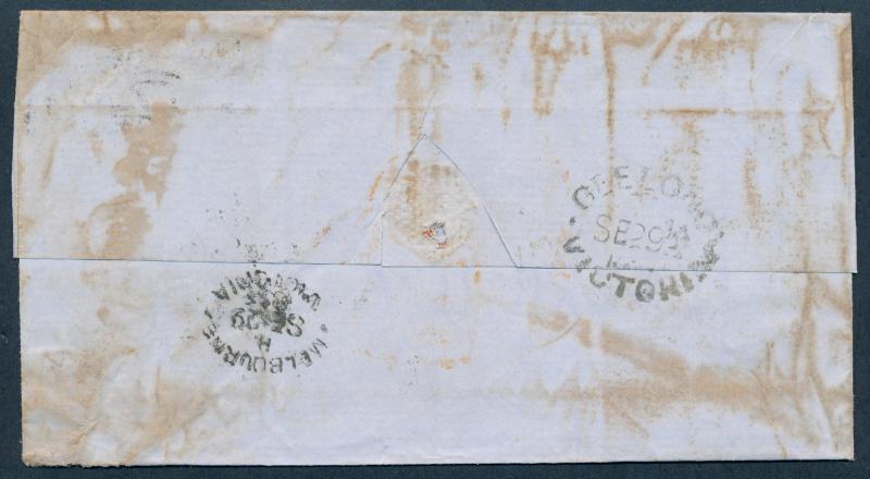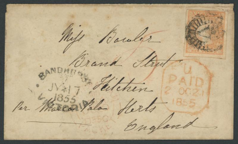 to large) cancelled by fair Barred Oval '5' (check) and fine crowned-oval 'SANDHURST/VICTORIA' datestamp on the face, light Melbourne backstamp, 'AUSTRALIAN/ PAID/LIVERPOOL/OC20/55/PACKET' cds and London 'PAID/21OC21/1855' Tombstone transits both in
