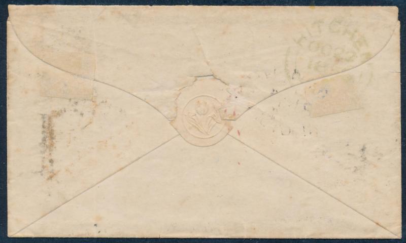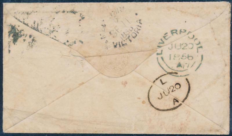 ship letter, plus 5c inland delivery. Carried by James Baines' Black Ball Line Clipper sailing ship 'Oliver Land' on a non-contract voyage departing Melbourne 2.5.1856 via Cape Horn arriving Liverpool 27.7.1856. Unrecorded in Ben Palmer's Census: he