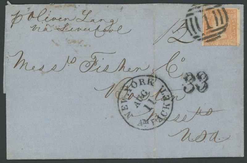 'NEW YORK/NOV/8/AM. PACKET' cds and '33'[c] postage due marking both on the face, a little minor gum staining on the reverse. Ex Floyd Risvold. 6d paid only the uniform ship letter to Great Britain. Because it was underpaid to the USA, it was