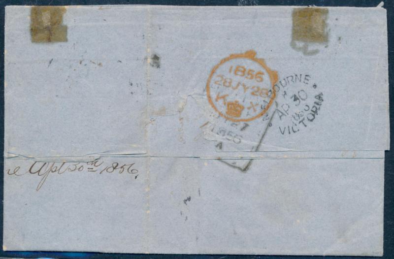 tied by two largely fine strikes of Barred Oval '2' cancel, fine crowned-oval 'GEELONG/VICTORIA' & Melbourne backstamps, largely very fine 'AUSTRALIAN/PAID/LIVERPOOL/DE28/55/ PACKET' cds and London 'PAID/29DE29/1855' Tombstone transits both in red on