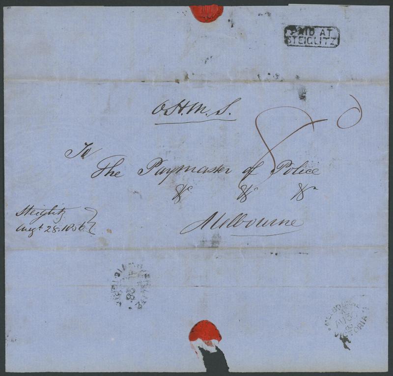 1856 (Aug 28) stampless OHMS entire letter to "The Paymaster of Police Melbourne" with fine 'PAID AT/STEIGLITZ' beveled-boxed