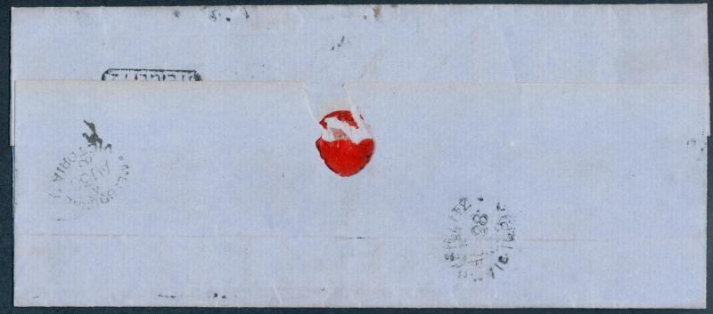 London 'PAID' Maltese Cross datestamp in red rated "2/3"[d] for the over ¼oz up to ½oz ship letter rate, largely very fine 'SHIP LETTER/FREE/NO 9/1854/G.P.O.VICTORIA' arrival backstamp in red, a few closed tears on the back flap & minor blemishes. Ex