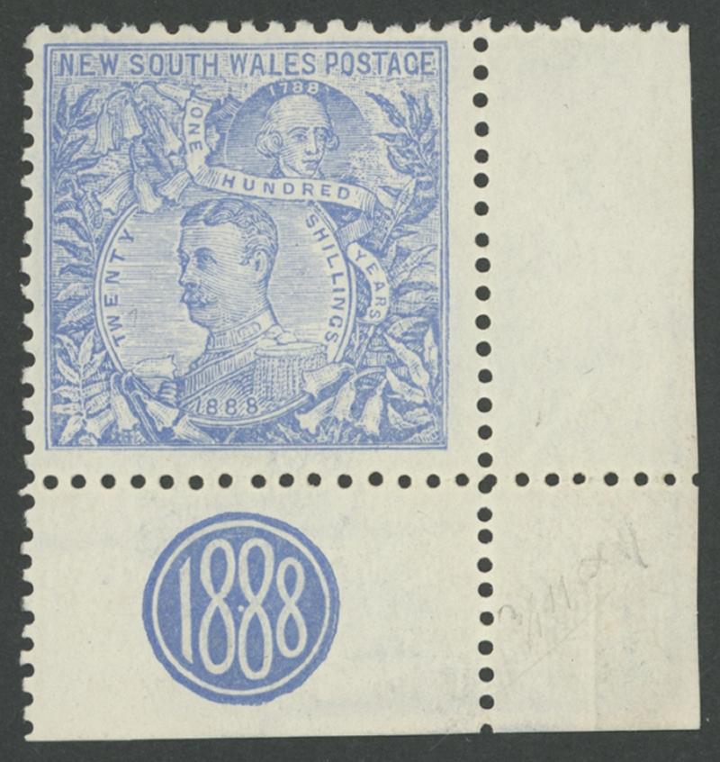 with '1888' Monogram, large-part gum with small hinge remainder, Cat $600+ (£375+) for a normal stamp: the ACSC doesn't list the monograms for the 20/-. Rare. Sold at our auction of 26.11.2005 for $1570 (Sale 119 Lot 338). A similar example sold at